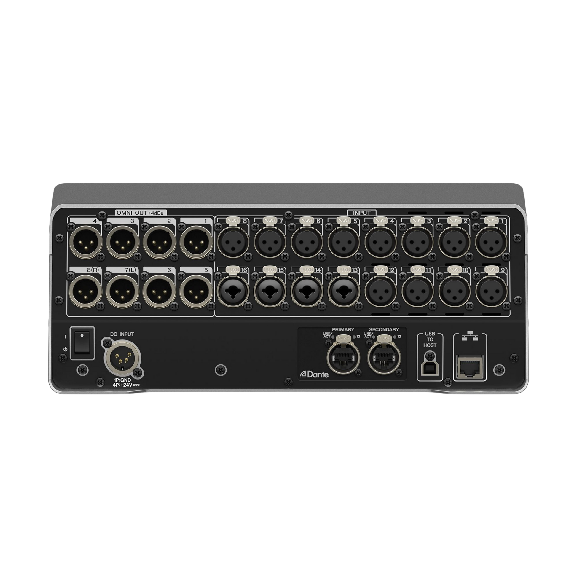 - E/S local: 16 entradas de micrófono/línea (12 XLR + 4 combo de auriculares XLR/TRS) y 8 salidas (XLR)