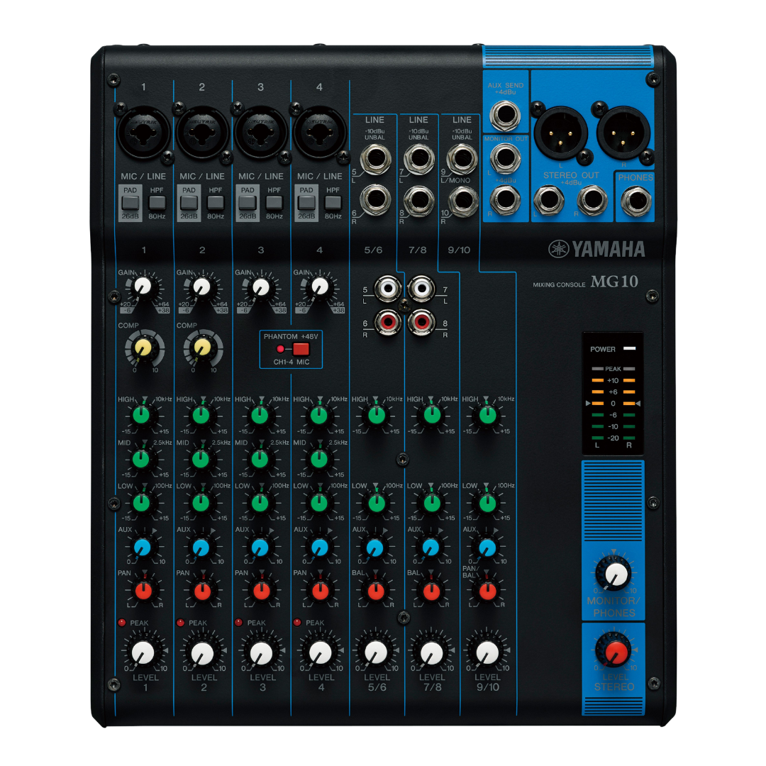 Mesa de mezclas de 10 canales: máximo 4 entradas de micro/10 de línea (4 mono + 3 estéreo); 1 bus estéreo; 1 envío AUX.